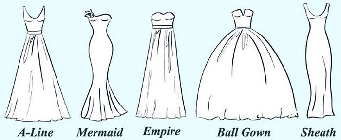 The wedding dress is an important decision in any ceremony. Some people have an idea of the exact dress since they were a child, while others have a hard time making the decision. It helps to narrow down your options by choosing the proper silhouette or style to fit your needs. There are five major styles of wedding dress including A-Line, Mermaid, Empire, Ball Gown, and Sheath. Check out the illustration above to get a basic idea, and let’s break down each dress style a little bit more.